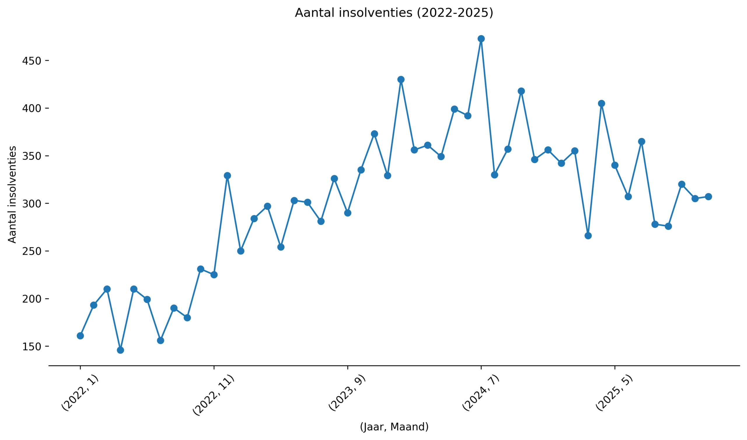 The trend in insolvencies shows a clear and consistent pattern. From the beginning of 2022 there is a steady build-up, which accelerates in 2023 and peaks around the middle of 2024. A clear reversal follows from February 2024: the number of insolvencies declines and stabilizes in 2025 at a level roughly comparable to that of 2022. With this, the acute bankruptcy wave seems to be over.