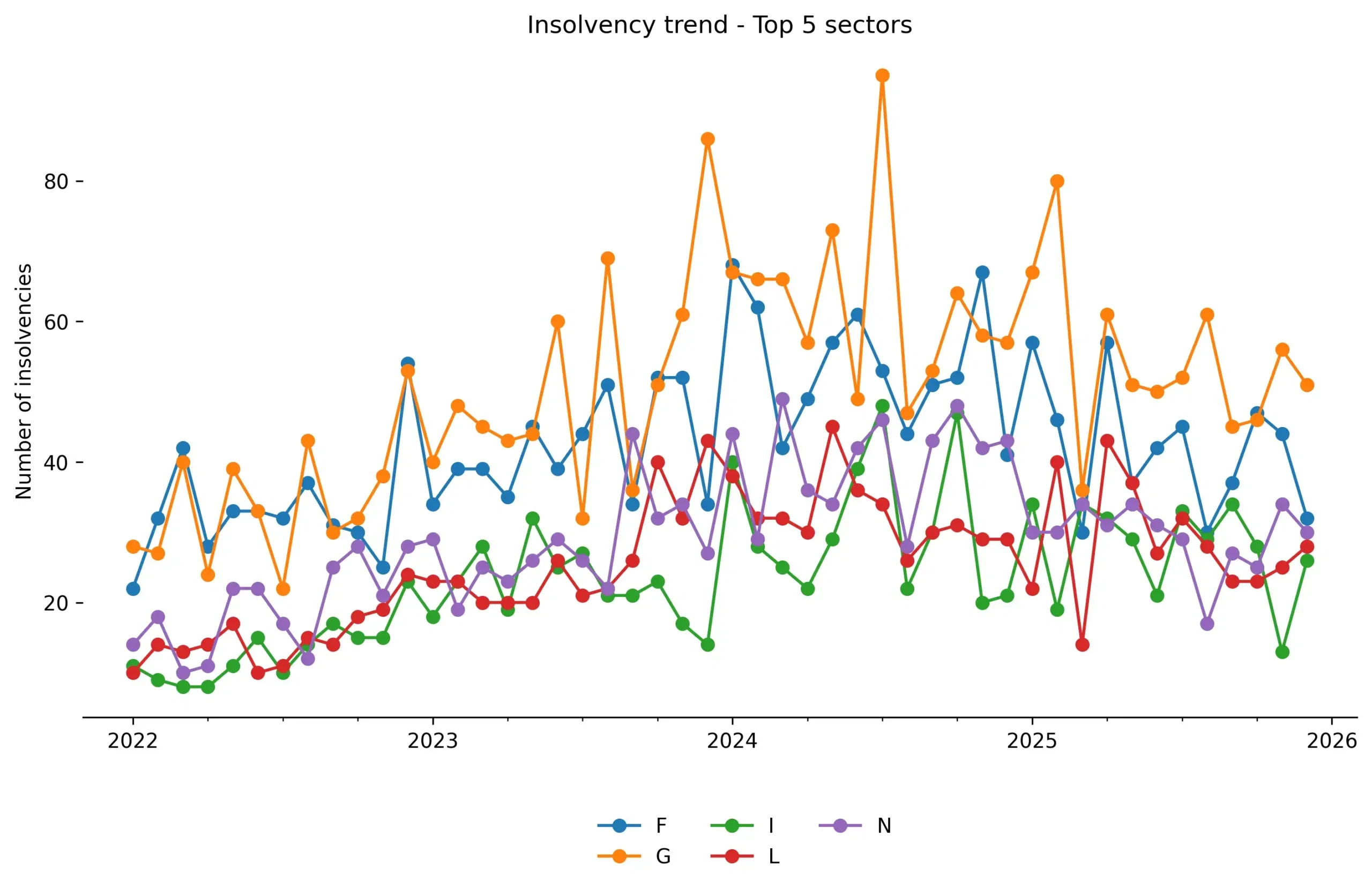 In particular, sectors Construction (F) and Wholesale and Retail Trade (G) account for a disproportionate share of the total throughout the period. These sectors show not only high levels but also strong volatility, indicating continued structural vulnerability rather than temporary aftermath. The development in the Lodging, Food and Beverage Services (Hospitality) sector (I) shows a different, but explainable pattern. This sector experienced a clear peak in bankruptcies just after the corona period.