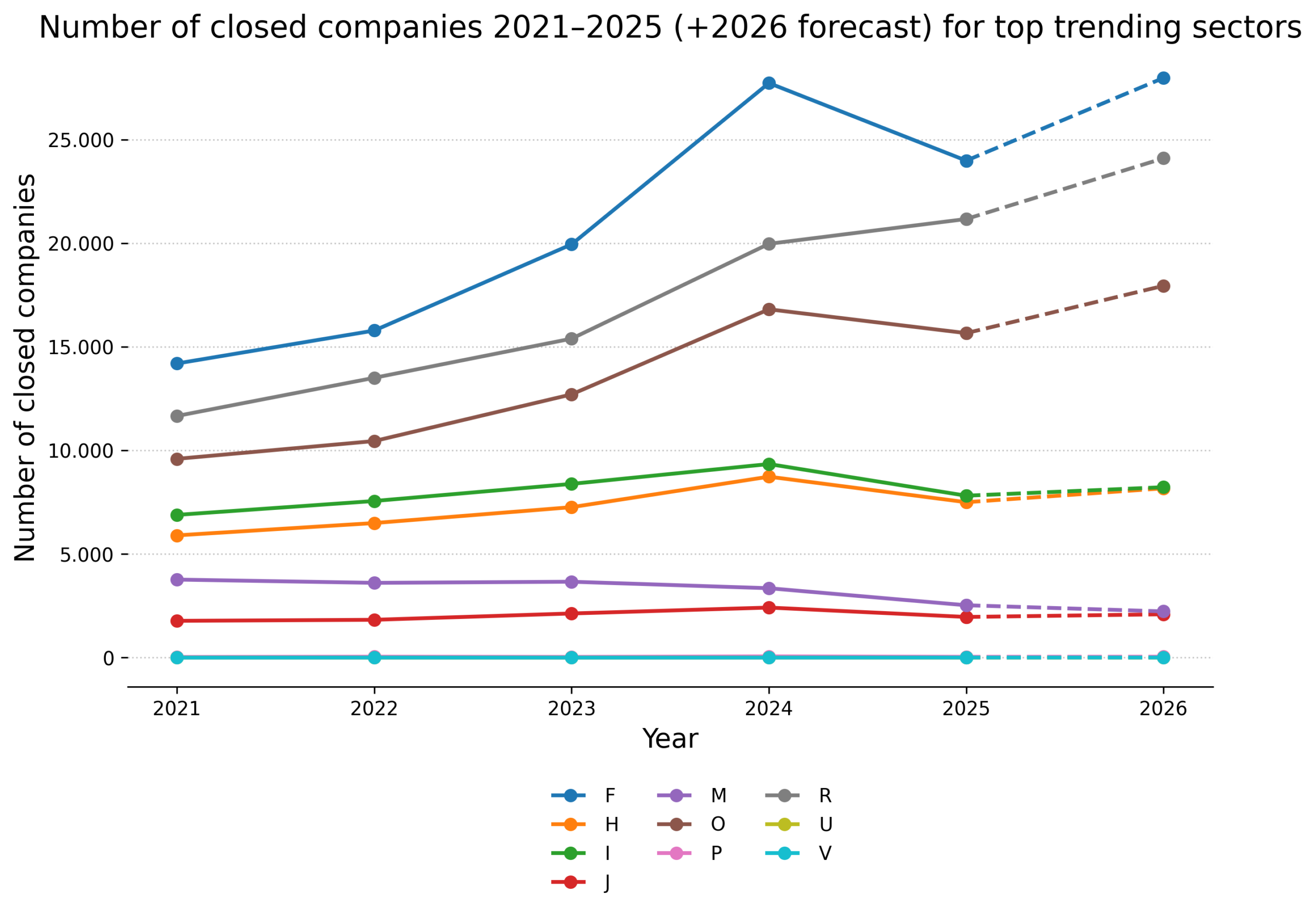 1. Structural strengthening: Real estate operation (sector M) stands out as one of the few sectors with a structurally increasing trend in recent years. Although the absolute net growth is not the highest, the balance improves year after year as the number of start-ups increases and terminations remain stable. The sector is adapting through restructuring and specialization, providing steady strengthening.