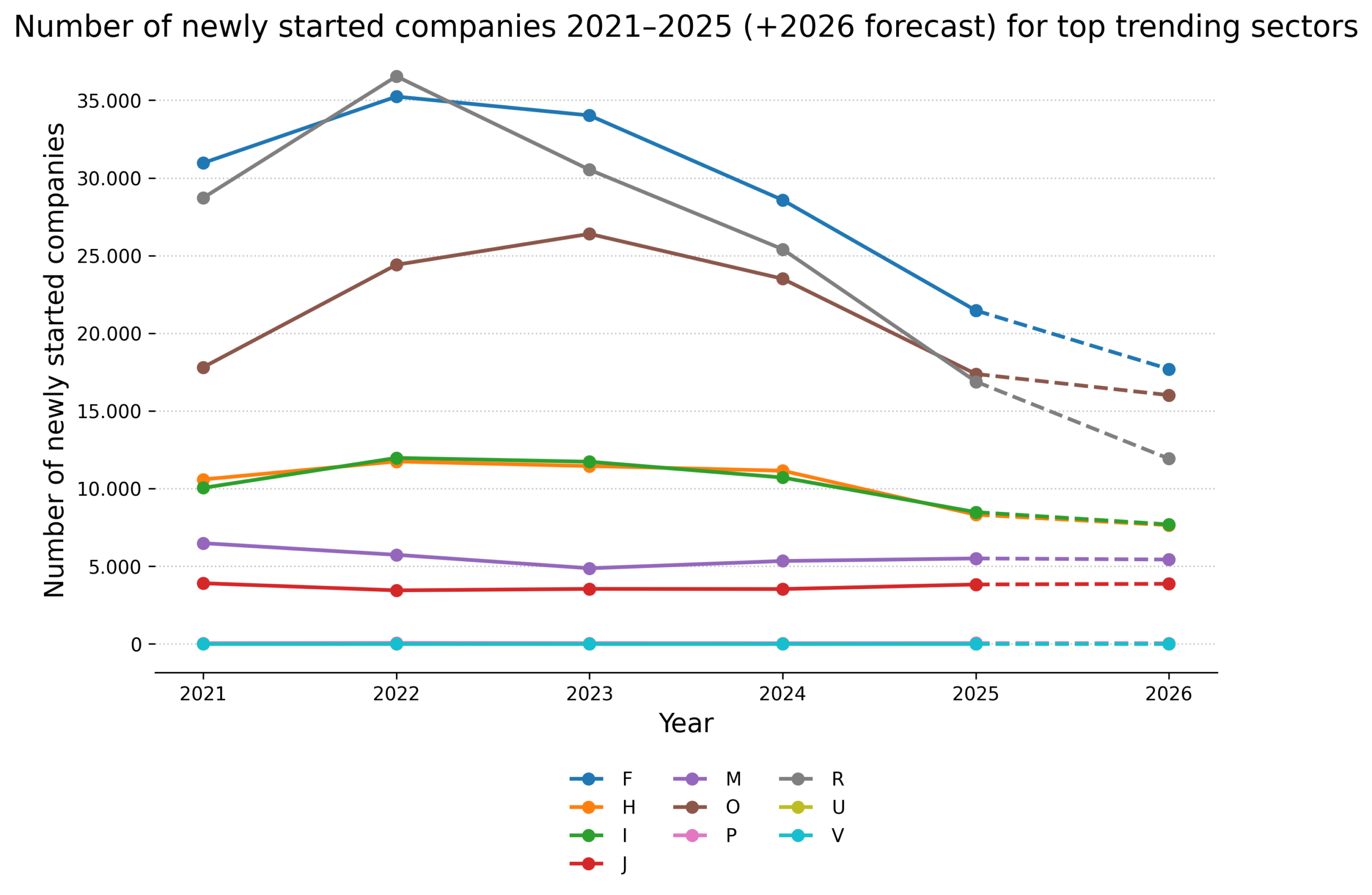 The 2024 and 2025 figures show that the entrepreneurship landscape is not moving uniformly, but is increasingly driven by sectoral differences. While some sectors consolidate or accelerate their growth, others turn from growth to contraction in a short period of time. The combined analysis of trend graphs and weighted net growth over the 2021-2025 period shows that these developments are less explained by occasional spikes but point to a structural realignment of entrepreneurship.