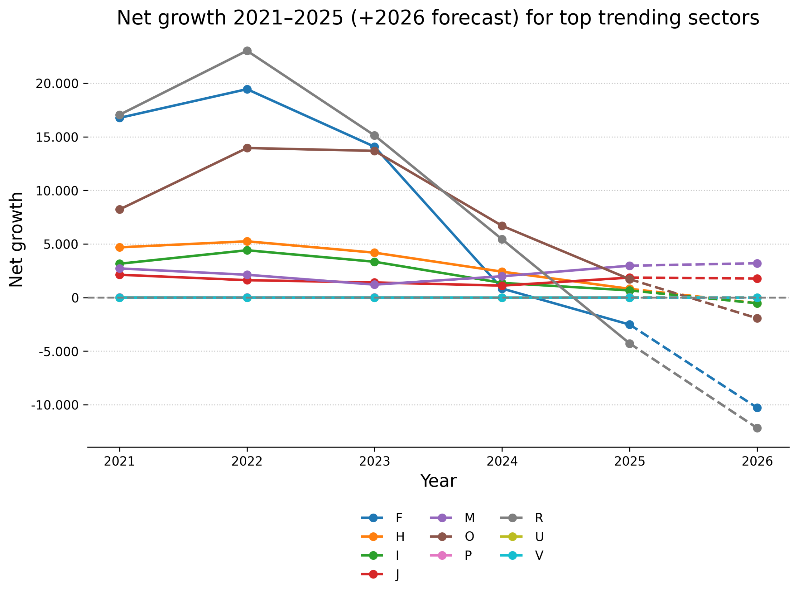 In addition to the technical sector, wholesale and retail trade (Sector G) also shows a marked acceleration. Net growth here rises sharply year-on-year, from +1,441 in 2024 to +3,885 in 2025. This indicates renewed business confidence, possibly fueled by stabilizing consumer spending and the further adaptation of business models to online and omnichannel sales.