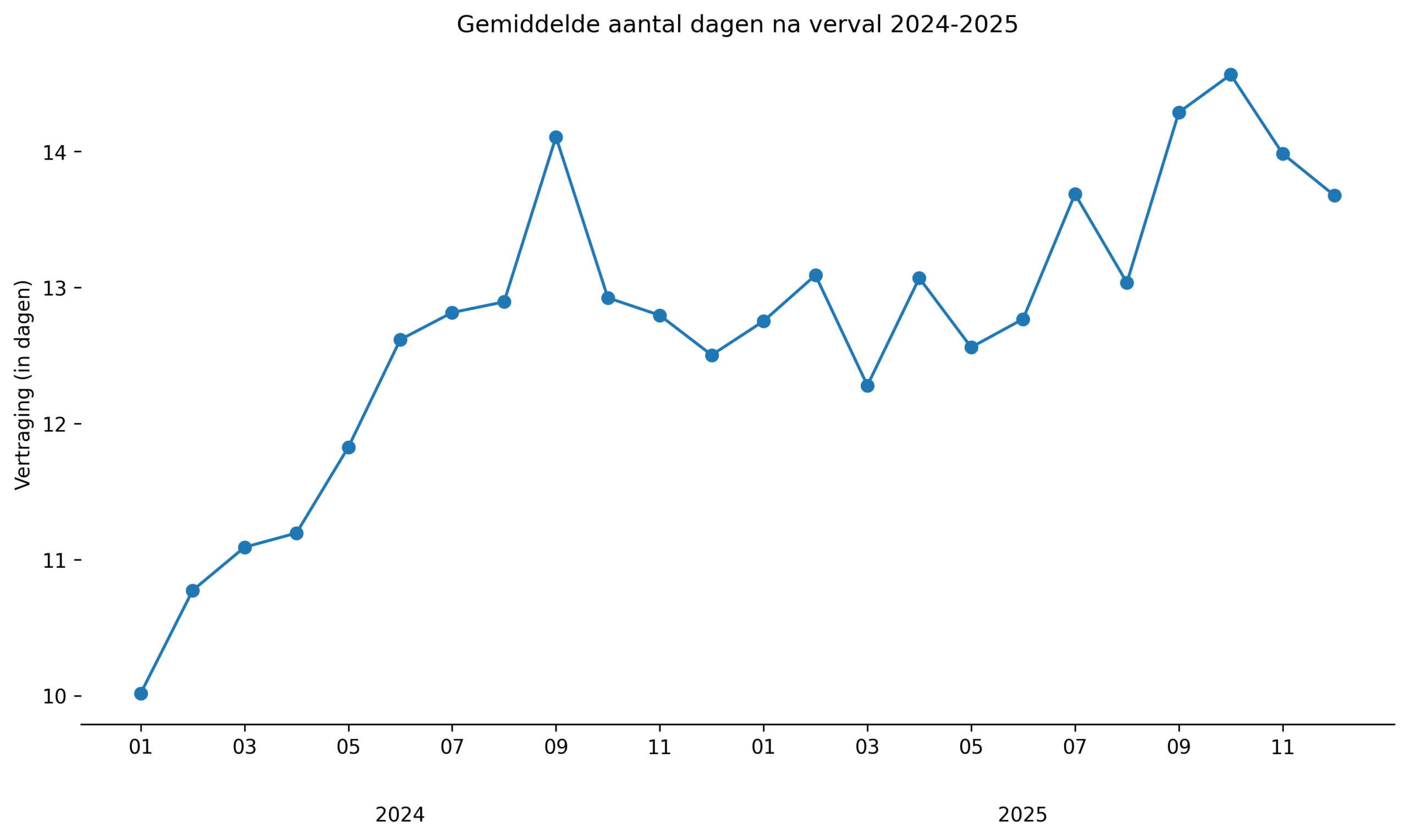 In 2025 ligt het uitgangsniveau al hoger en loopt de vertraging verder op, met een piek rond de 14 tot 15 dagen in het najaar. In tegenstelling tot 2024 is het herstel richting het einde van het jaar minder uitgesproken. De betaalvertraging blijft structureel hoger liggen.