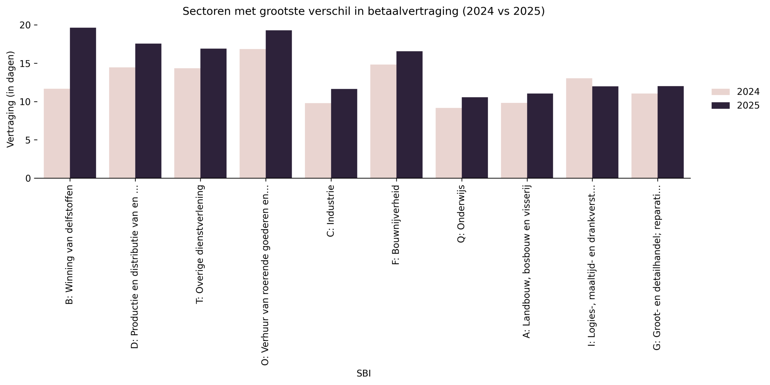 Wanneer de betaalinformatie over 2024 en 2025 naast elkaar wordt gelegd, zien we een lichte verslechtering: in vrijwel alle sectoren ligt de betaalvertraging in 2025 hoger dan in 2024.