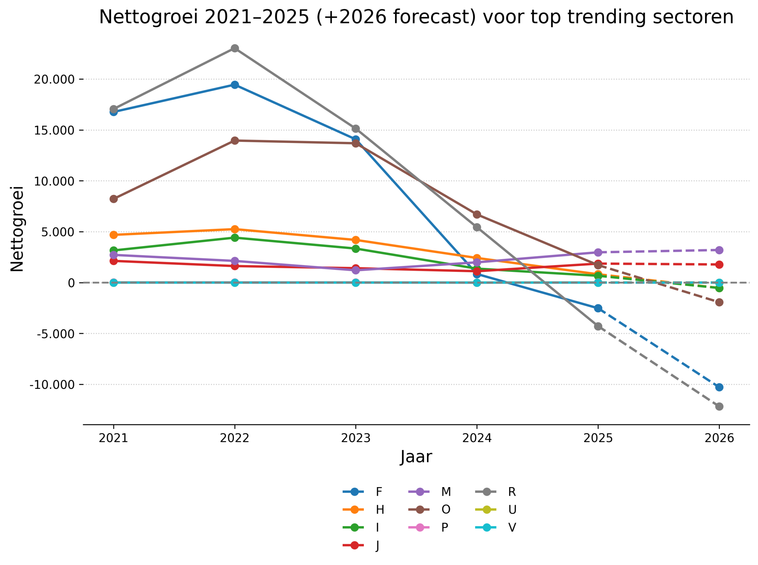 | SBI | Sector | Nettogroei 2024 | Nettogroei 2025 | Verandering |