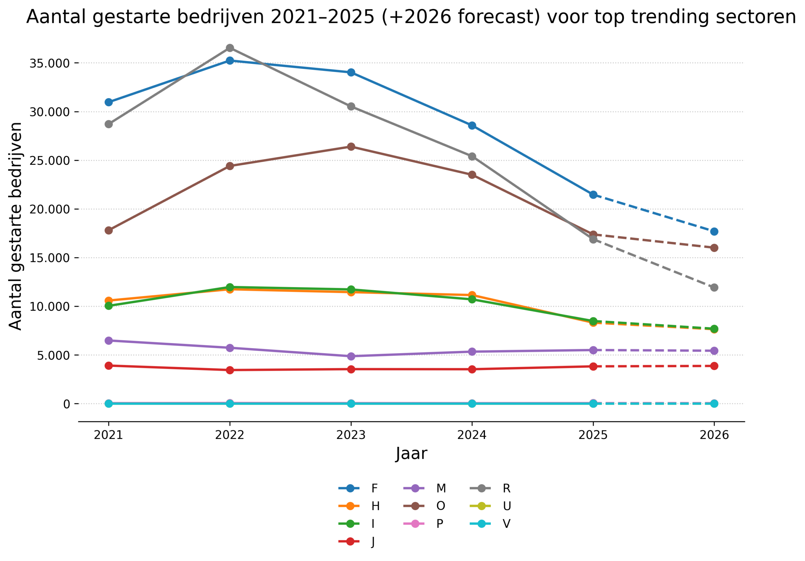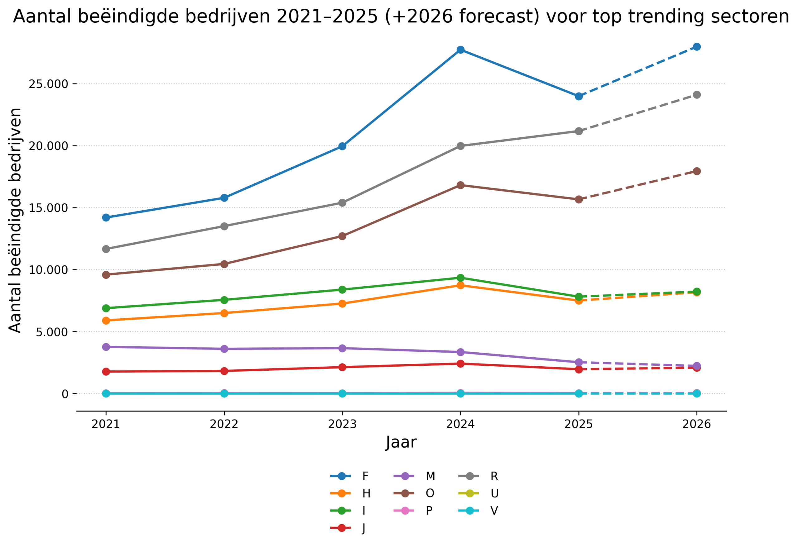 2. Structurele erosie: In tegenstelling tot het vastgoed laat de zorgsector (R) een geleidelijke erosie zien. Na een piek in 2021 en 2022 vlakte de groei af, om in 2025 negatief te worden door een combinatie van minder starters en meer stoppers. Ook de bouwnijverheid (F) kampt met een aanhoudende verzwakking van het ondernemingsklimaat, waarbij de uitstroom piekt in 2023 en 2024.